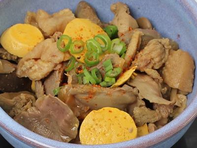 | 原材料名 | 親鶏肉、鶏砂肝、鶏きんかん、親鶏卵巣、鶏レバー、しょうが、果糖ぶどう糖液糖、食塩、醬油、魚醤(魚介類)、鶏がらだし、たん白加水分解物、酵母エキス、かつおだし、こんぶエキス、ほたてエキス/調味料(アミノ酸等)、カラメル色素、(一部に卵・小麦・大豆・ゼラチンを含む) |