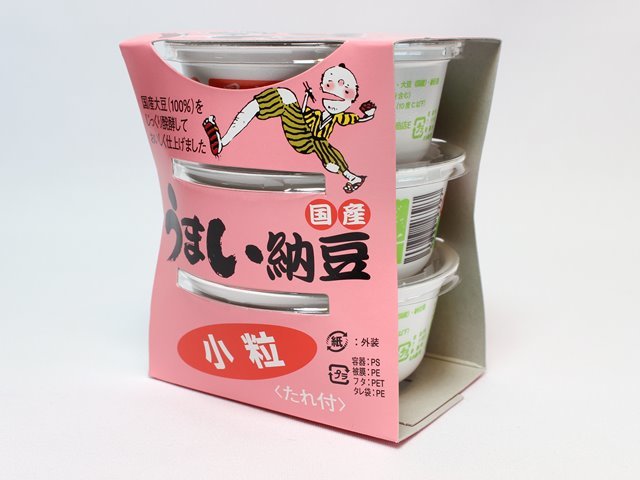 小粒の国産大豆を100%使用。納豆らしい大豆の香り、甘味、苦味が強く感じる昔ながらの粘りの強い納豆です。かき混ぜやすい、フタ付きの丸型カップを使用しています。